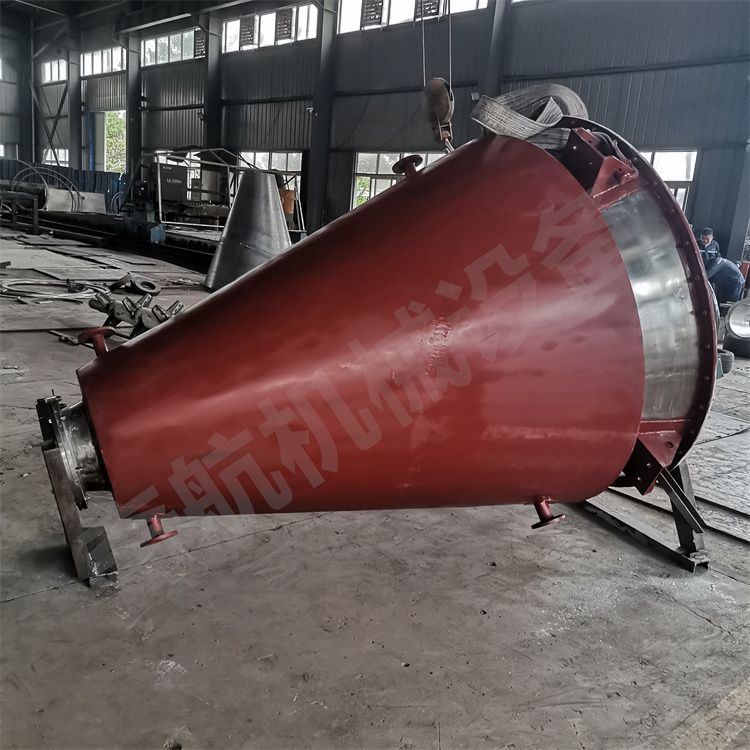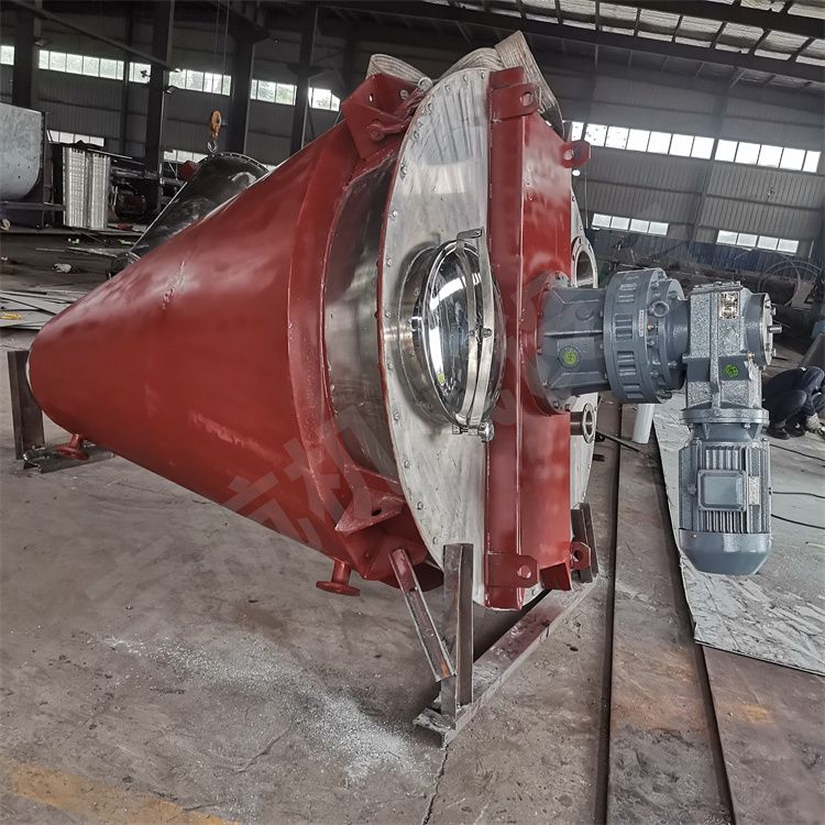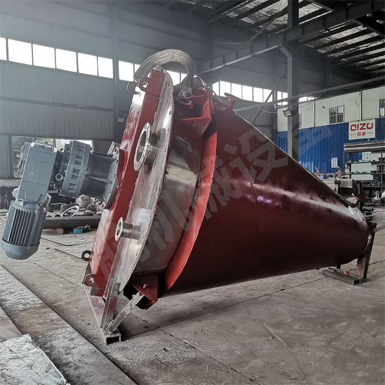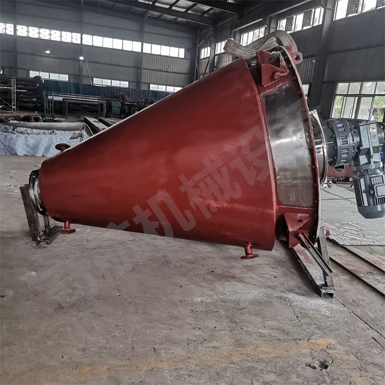 锥形混合机产品描述:锥形筒体内安装有沿锥形螺旋线的外圈螺带以及锥形中轴线的内圈螺旋,外圈螺带沿筒壁提升物料,内圈螺旋反向作用,漩涡状的物料流动轨迹,可使物料在短时间内混合均匀。外圈螺带能够全周性的带动物料,在出料过程中,外圈螺带清除贴壁物料,内圈螺旋排出物料。结合倒锥形的筒身,即使流动性差的物料也能迅速出料,且无残留。此型号混合设备适用于流动性能比较差的物料混合。