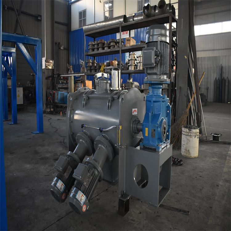 犁刀混合机由筒体、旋转主轴、犁刀组、粉粹器组、支撑件、传动件、喷头、夹套等构成。启动电机后,主轴带动犁刀组旋转,物料沿犁刀两侧面的法线方向抛出,流经粉粹器组时,被高su旋转的粉粹器迅速地打断、分散。物料被高su 粉粹器分散后,跌入混合机底部,犁刀组提供了物料混合所需要的复合力,被混合物料在混合机内部做复合循环,迅速到达混合目的。犁刀式混合机主轴及粉粹器组固定方式为外置轴承座,和筒体接触处采用轮毂填料密封,其添料盒为精加工件,从而混合机的密封性能,不漏料,很好地保护了外置轴承。混合机底部采用气动大开门结构,密封严密,卸料