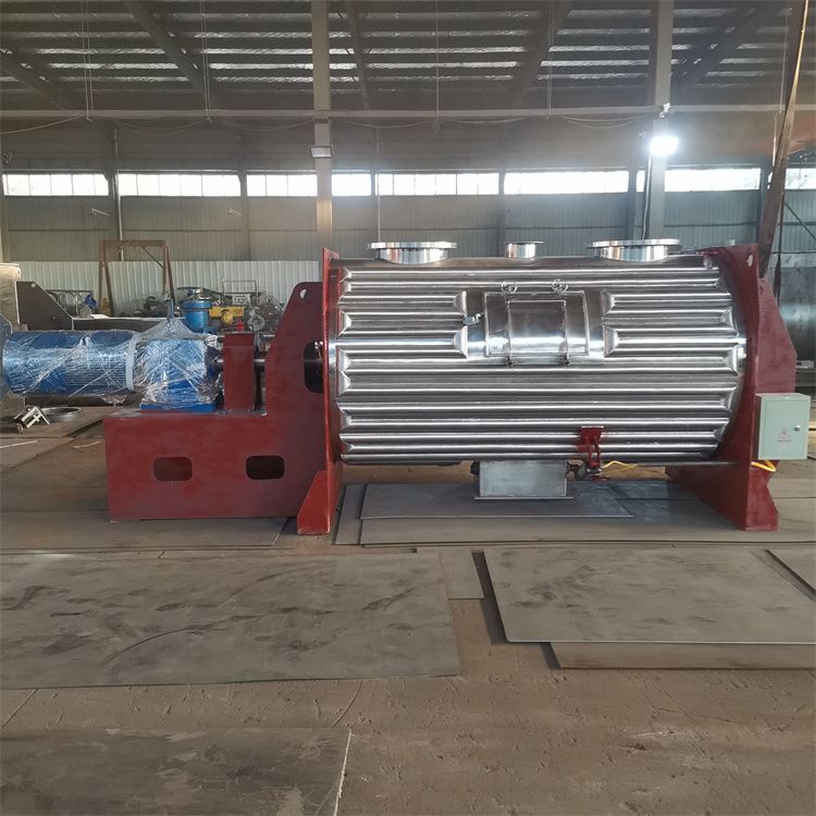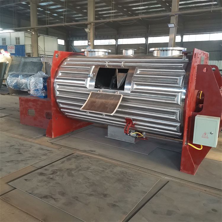 犁刀混合机由筒体、旋转主轴、犁刀组、粉粹器组、支撑件、传动件、喷头、夹套等构成。启动电机后,主轴带动犁刀组旋转,物料沿犁刀两侧面的法线方向抛出,流经粉粹器组时,被高su旋转的粉粹器迅速地打断、分散。物料被高su 粉粹器分散后,跌入混合机底部,犁刀组提供了物料混合所需要的复合力,被混合物料在混合机内部做复合循环,迅速到达混合目的。犁刀式混合机主轴及粉粹器组固定方式为外置轴承座,和筒体接触处采用轮毂填料密封,其添料盒为精加工件,从而混合机的密封性能,不漏料,很好地保护了外置轴承。混合机底部采用气动大开门结构,密封严密,卸料